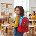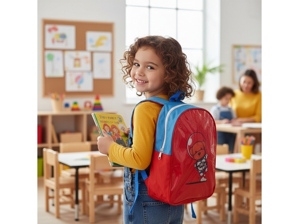 Nursery school backpack for preschoolers, with a cute puppy spaceman picture on the front. With 1 main zippered compartment and adjustable shoulder strap.